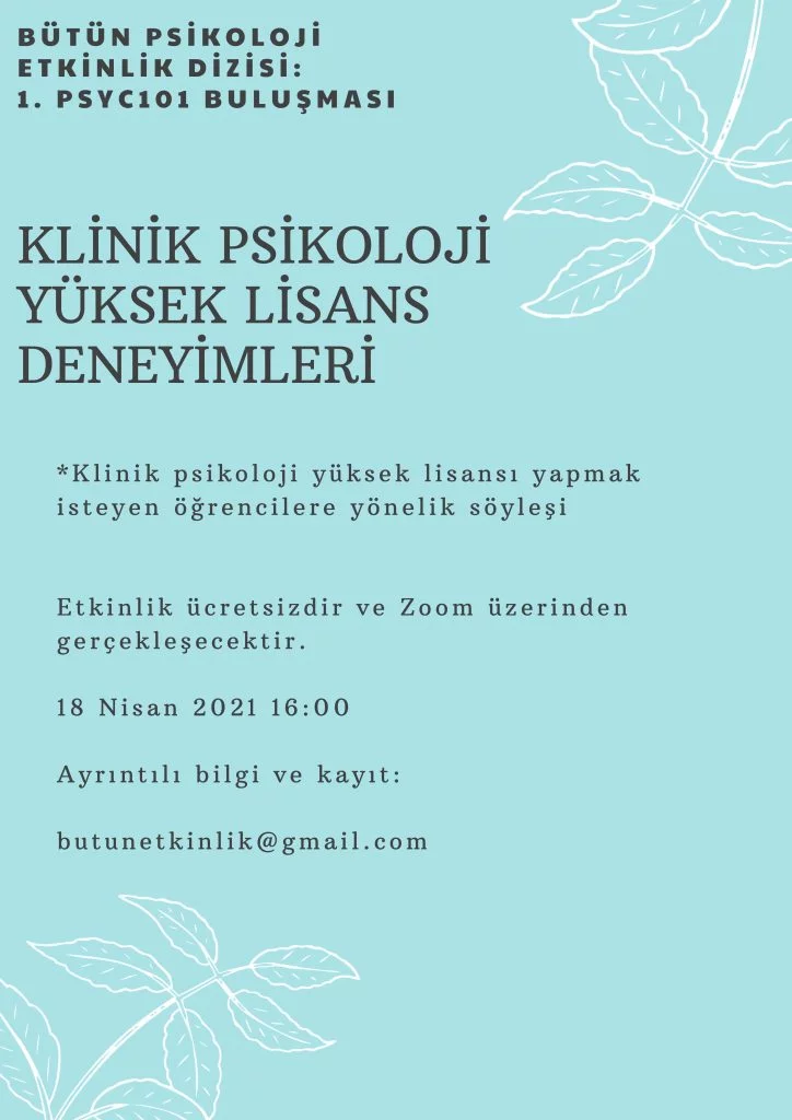 🔹 Klinik psikoloji yüksek lisansı hakkında bilgi almak isteyen öğrencilere yönelik 1. Psyc101 buluşmasını 18 Nisan’da gerçekleştiriyoruz.