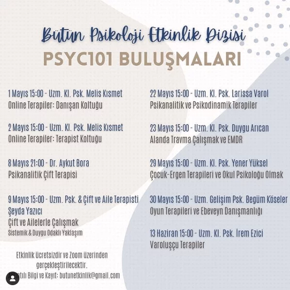 2 Mayıs Pazar günü ise online terapilere terapist koltuğundan bakacağız. Online terapi yapan psikoterapist olmakla ilgili soruları olan öğrencileri, terapist adaylarını ve terapistleri aramızda görmekten mutlu olacağız.